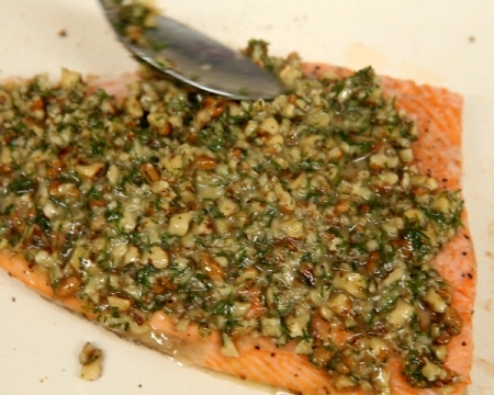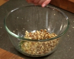 | Орехите и копърът се накълцват и се смесват с кафявата захар, лимоновия сок, разтопеното масло, сол и черен пипер на вкус. |