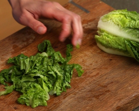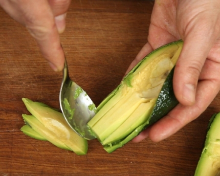 | Авокадото се разполовява, костилката се отстранява, а месестата част се нарязва на ивички. |