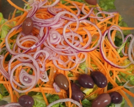 | Така подготвените зеленчуци се смесват в купа, прибавят се и маслините. |