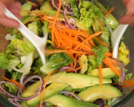 | Салатата се овкусява със зехтин, лимонов сок и сол. Разбърква се добре. |